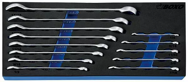 Tämä 13-osainen BOXO kiintolenkkiavainsarja sisältää yleisimmät tuumakoot, ja se on erinomainen valinta niin ammattilaisille kuin harrastajillekin. Sarja toimitetaan kätevässä vaahtomuovimoduulissa, joka pitää avaimet järjestyksessä ja helposti saatavilla. Moduulin ansiosta sarja sopii erinomaisesti myös työkalulaatikkoon tai -vaunuun.