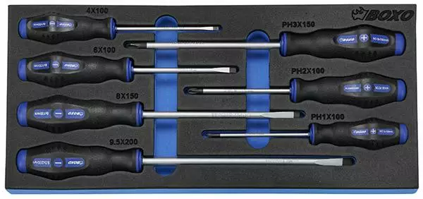 Boxo Lyöntiruuvitalttasarja (284-BX005A) on erinomainen valinta niin ammattilaisille kuin vaativille harrastajillekin, jotka arvostavat kestävyyttä ja monipuolisuutta. Sarja toimitetaan käytännöllisessä vaahtomuovimodulissa, joka on yhteensopiva Boxo-laatikostojen kanssa, mikä mahdollistaa siistin ja järjestelmällisen säilytyksen.