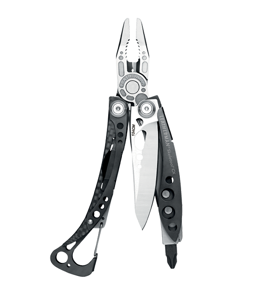 - Monipuoliset työkalut: Skeletool CX sisältää kärkipihdit, sivuleikkurit, 154CM-teräksestä valmistetun veitsen, ristipää- ja ruuvimeisselit, pullonavaajan sekä irrotettavan vyöklipsin.