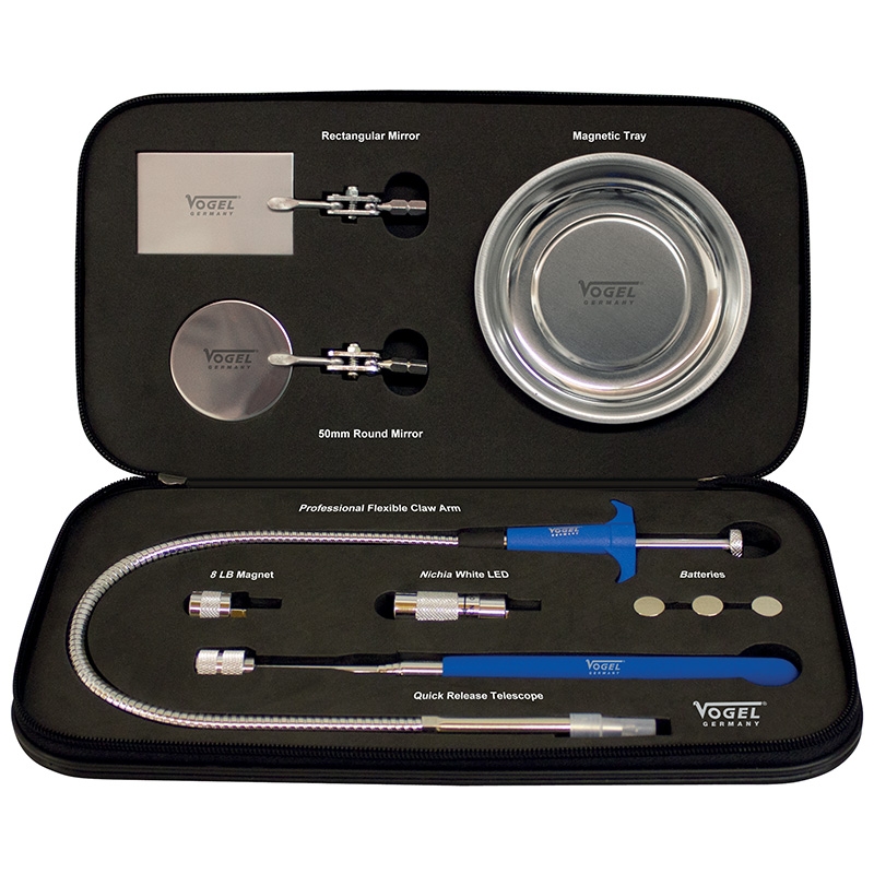 Ahtaiden kohteitten työskentely- ja tarkastussarja vahvalla magneetilla ja LED-valolla. Letkuvartinen tartunta- / poimintatyökalu sekä teleskooppivartinen työkalu 530 mm magneettitarttujalla tai LED-valolla + laadukkaat tarkastuspeilit