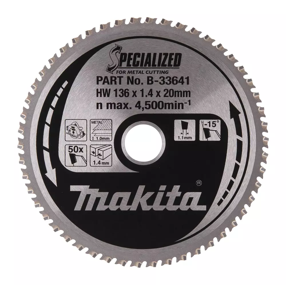 Tehokas ja kestävä Makita Specialized -pyörösahanterä metallin sahaamiseen. Tämä terä on suunniteltu erityisesti akkumetallipyörösahoille, ja se tarjoaa tarkan ja puhtaan leikkuujäljen. Terän halkaisija on 136 mm, ja siinä on 50 hammasta, joiden leveys on 1,4 mm. Reiän halkaisija on 20 mm.