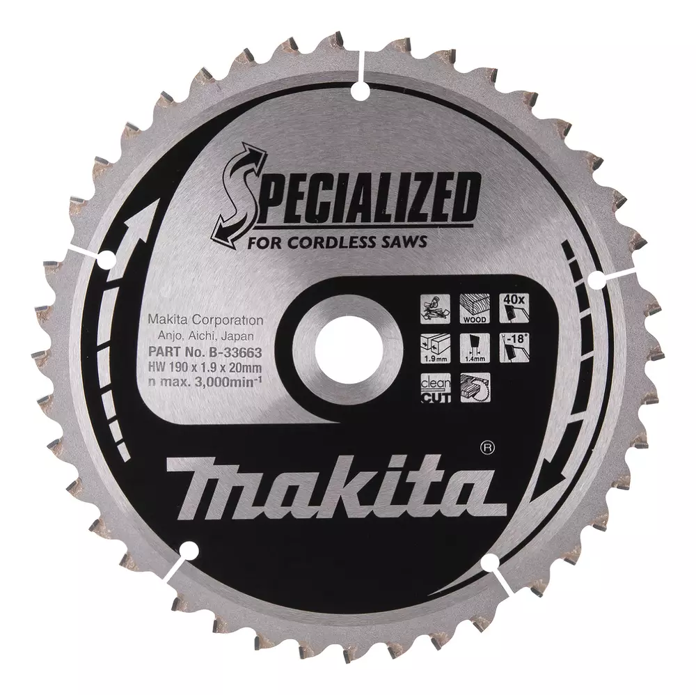 Tämä Makita Specialized -sarjan pyörösahanterä on suunniteltu erityisesti puun sahaamiseen akkujiirisahoilla. Terän halkaisija on 190 mm ja siinä on 40 hammasta, mikä takaa siistin ja tarkan sahausjäljen. Terän hampaan leveys on 1,9 mm ja reiän halkaisija 20 mm.