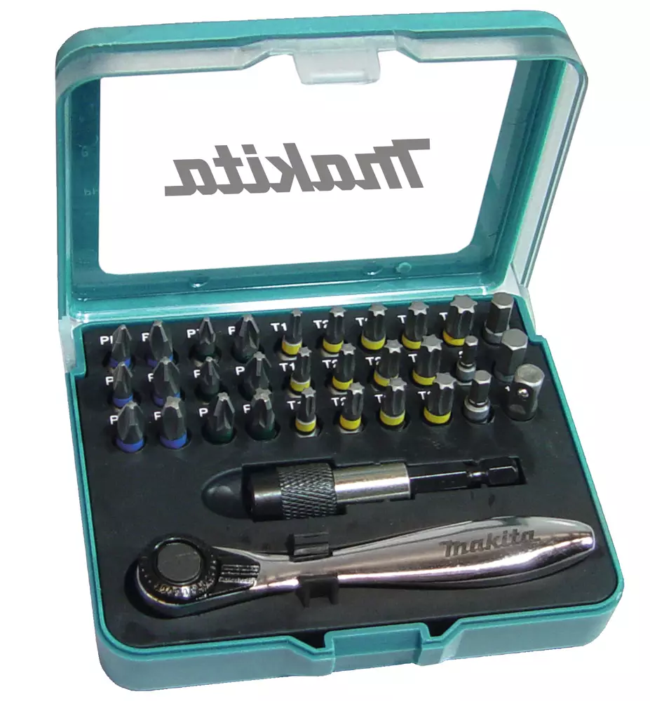 Makita P-79790 on 32-osainen ruuvikärkisarja, jossa on kaikki tarpeellinen siististi yhdessä paketissa: yleisimmät 25 mm Torx-, PH-, PZ- ja kuusiokärjet, magneettinen lukittava pitimen, adapteri 1/4" hylsyille – ja bonuksena vielä räikkäväännin, jolla työskentely sujuu kuin tanssi, vaikka olisi vähän tiukempikin kolo kyseessä.