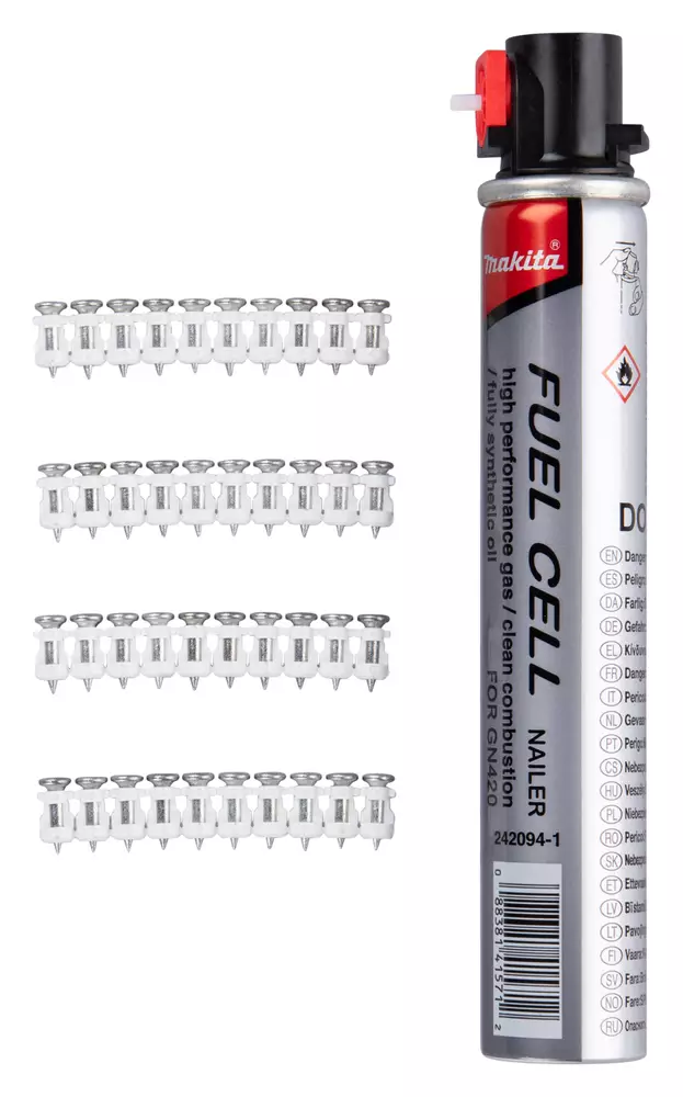 Suunniteltu Makita GN900SE -naulaimelle Tämä tarvikepakkaus on suunniteltu ja valmistettu erityisesti Makita GN900SE -kaasubetoninaulaimelle. Alkuperäisten Makita-naulojen ja -kaasun käyttäminen varmistaa naulaimen moitteettoman toiminnan, ehkäisee syöttöhäiriöitä ja takaa työkalullesi pitkän käyttöiän.